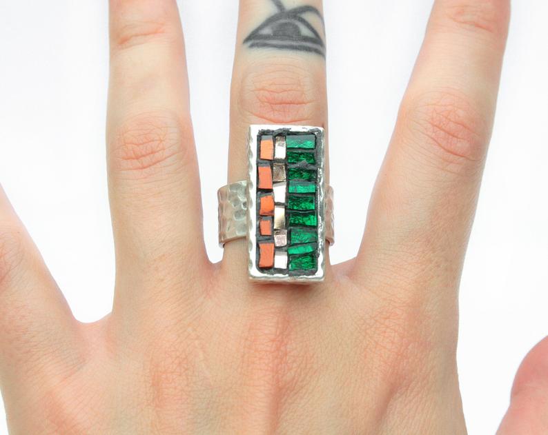 Splendido anello rettangolare con micro mosaico italiano di vetro colorato nelle sfumature del bosco: un’idea regalo speciale per gli amanti dei gioielli unici!